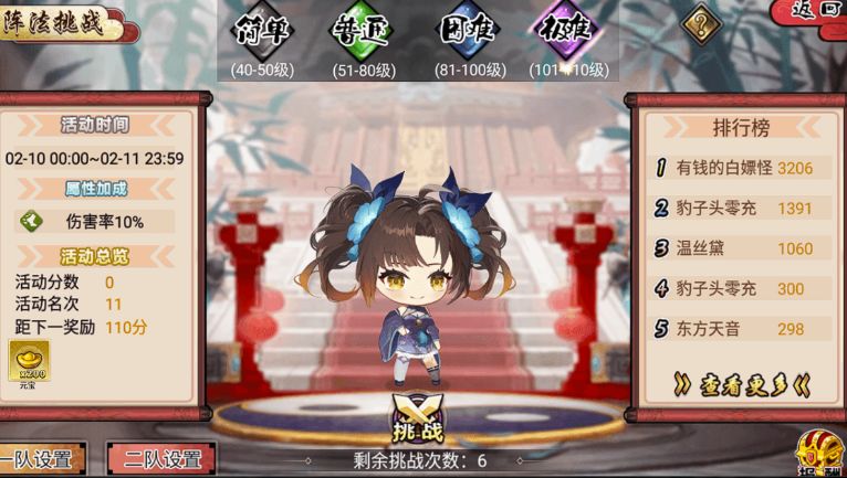 2.阵法挑战使用多阵容进行挑战,替补位无法使用