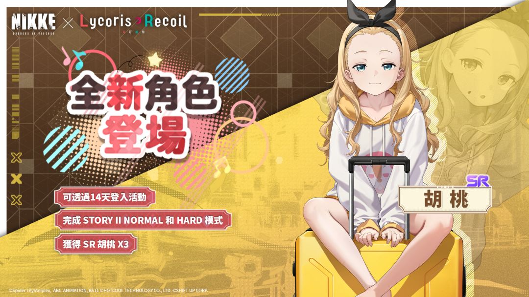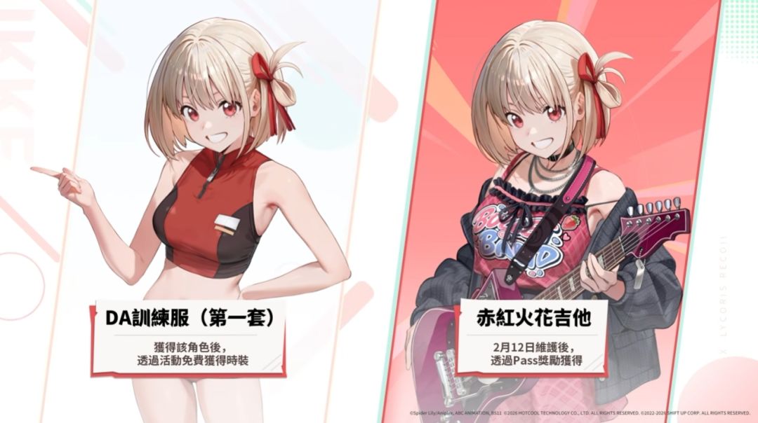枪械少女 RPG《胜利女神:妮姬》国际服在2月5日正式宣布,现已公开《胜利女神:妮姬》×《Lycoris Recoil 莉可丽丝》联动PV。本次PV中公布了即将上线的三位联动角色:锦木千束(SSR)、井上泷奈(SSR)、胡桃(SR);并且会根据《莉可丽丝》设计新的时装、活动、小游戏。也将增加新的主线篇章43、44章。胜利女神妮姬×莉可丽丝(国际服)联动12日更新前瞻!!!