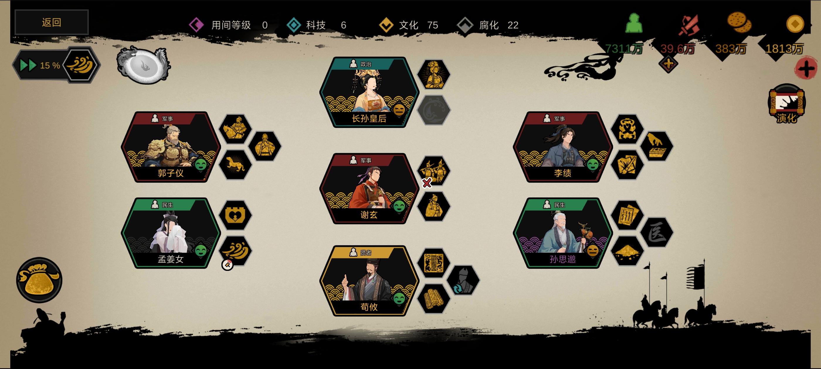 配置方面李绩,长孙皇后,谢玄,孟姜女。贤者我带个荀攸,但好像不是很好用。