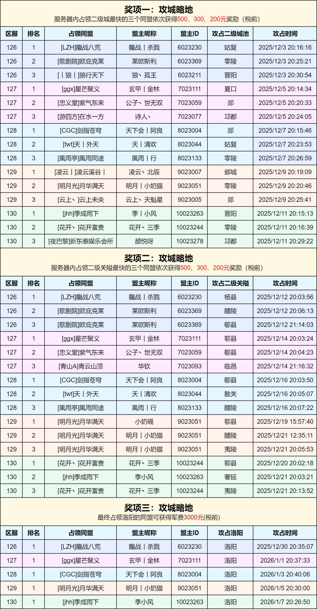 1、奖项一、奖项二的盟主人选,以占领城池时的人选为依据;