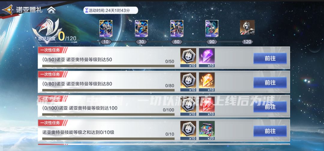 活动期间,各位队员解锁诺亚奥特曼后,进行养成,即可解锁对应等级赠礼