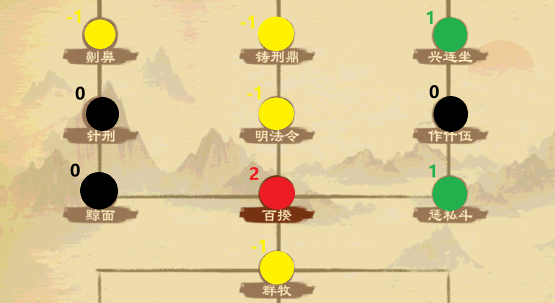 2级加成不错的政策很多必点(红色)1级以我的侧重点认为加成较好的政策(绿色) 0级不在我的侧重点认为加成较差的政策但负面还可接受的政策(黑色) -1级纯负面或负面效果大于正面效果的政策(黄色)新手微知识(对法家的分析)