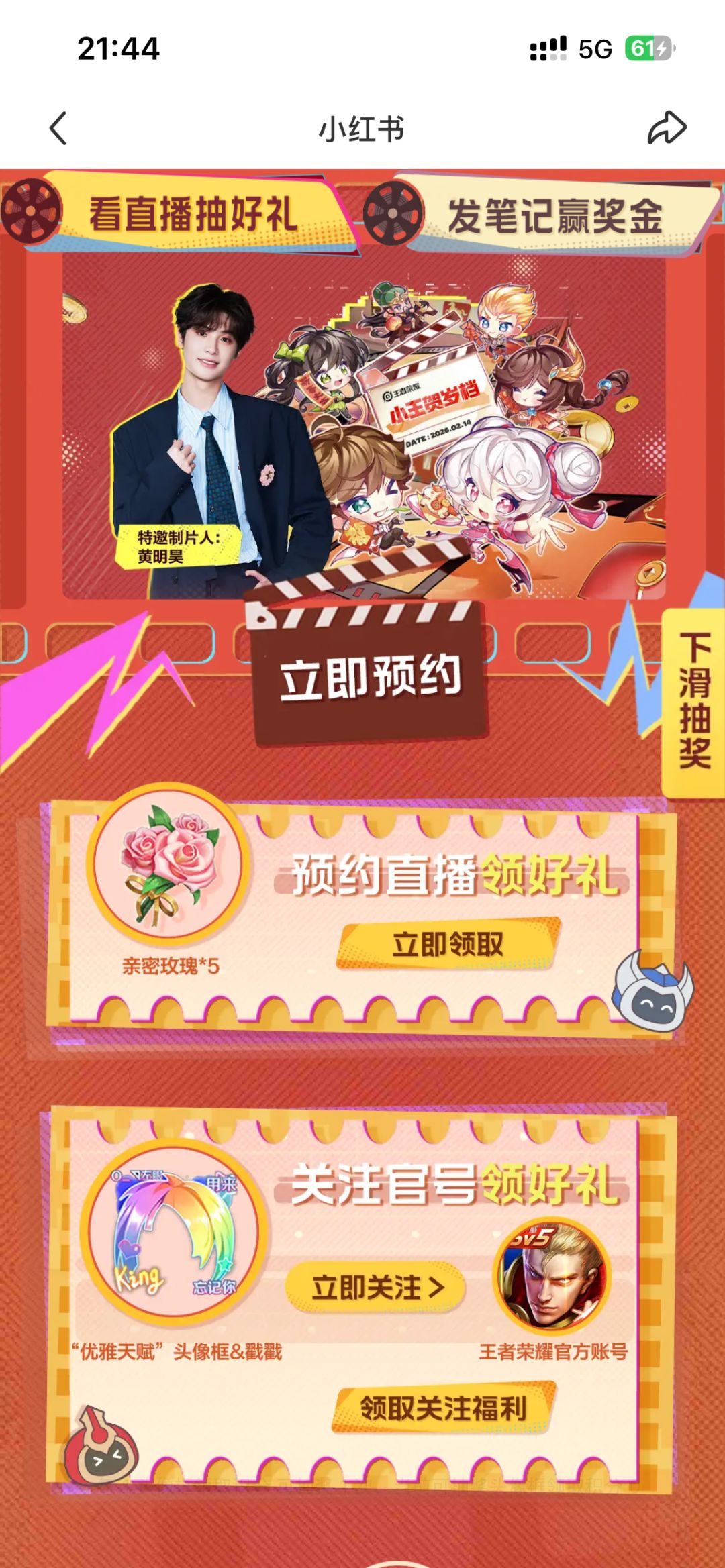 (小声:其实这是王者和小红书联名贺岁直播的预约福利,2月14日还有黄明昊/九尾/Blue直播抽限定皮肤,薅完头像框记得去预约!)