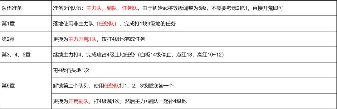 - 主力队和副队:直接从4级地/贼寇进行开荒。