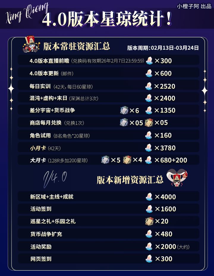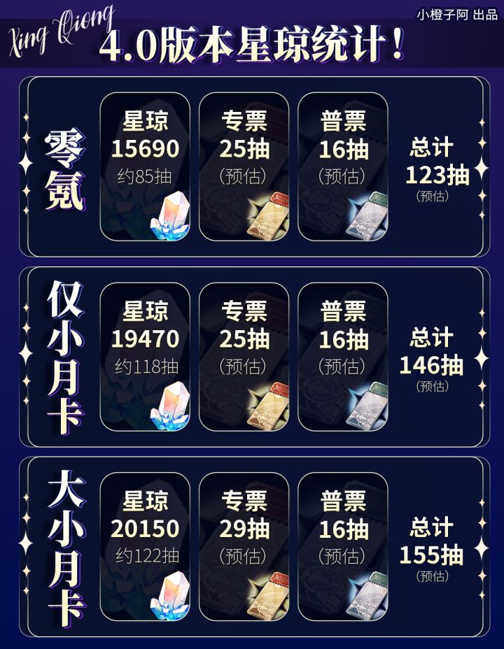 这一篇是星铁v4.0新版本抽数统计,整体分为总体统计与各内容版块统计,总体统计分为了:零氪、小月卡与大小月卡,方便大家根据自身需求选择查阅。