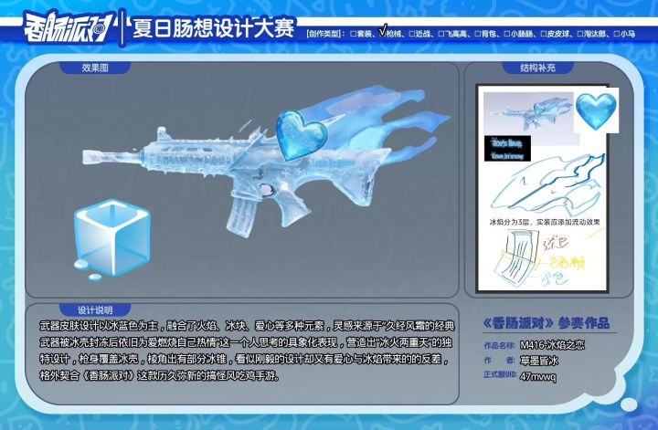武器皮肤设计以冰蓝色为主。融合了火焰、冰块、爱心等多种元素,这款武器被冰壳封冻后依旧为爱燃烧。营造出“冰火两重天”的独特设计,枪身覆盖冰壳,棱角处有部分冰锥,看似刚毅的设计却又有爱心与冰焰带来的反差,格外契合《香肠派对》这款历久弥新的搞怪风吃鸡手游的夏日风格,虽有炎热,但相约[香肠派对],心情依旧清凉,肠肠们热情依旧。