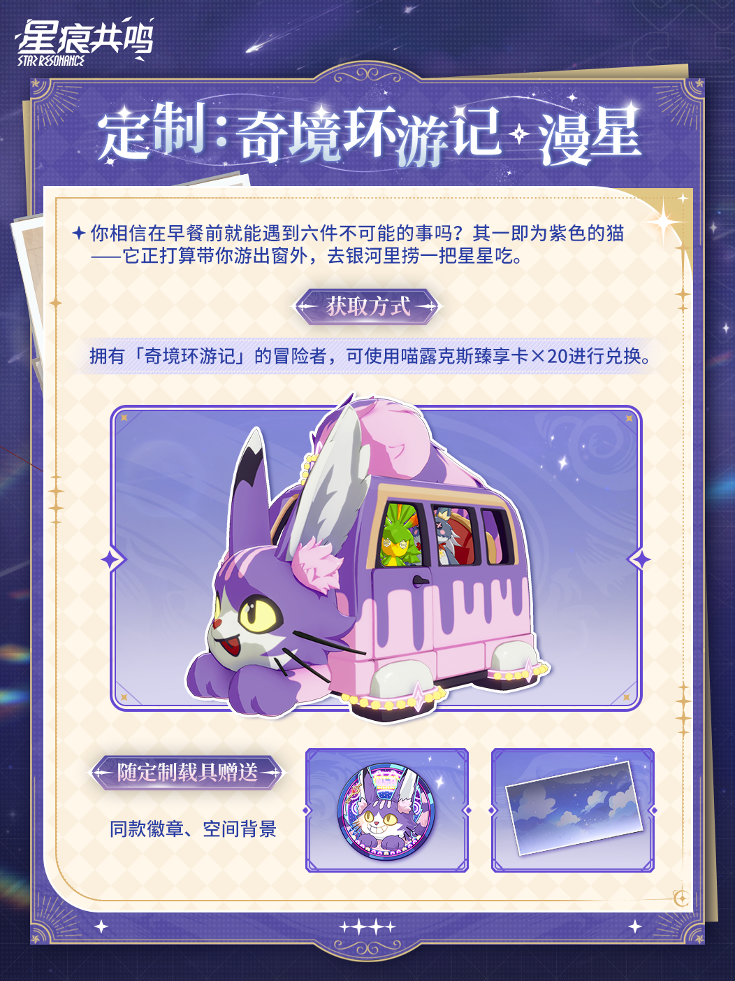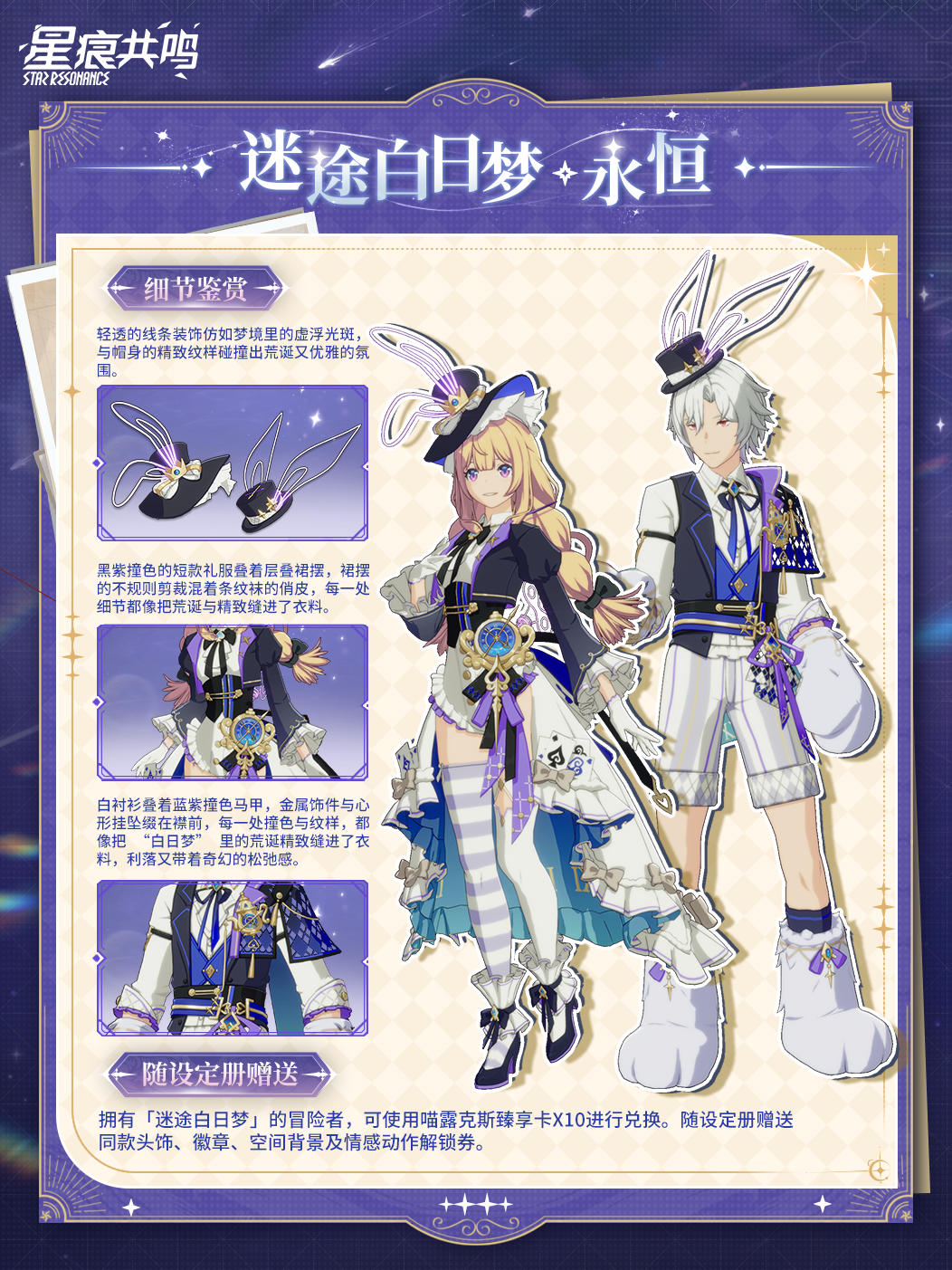 随设定册赠送系列单品、徽章、空间背景及情感动作解锁券。年初新装「迷途白日梦·永恒」搭配定制载具「奇境环游记·漫星」,畅享如梦似幻的美妙~
