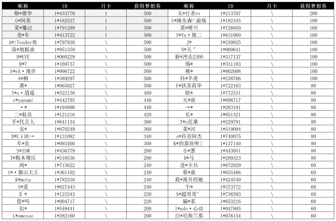单周排行榜奖励:单轮第1-3名分别获得100/80/60张梦想奖券;每周总榜单前4名额外各获月卡1张;