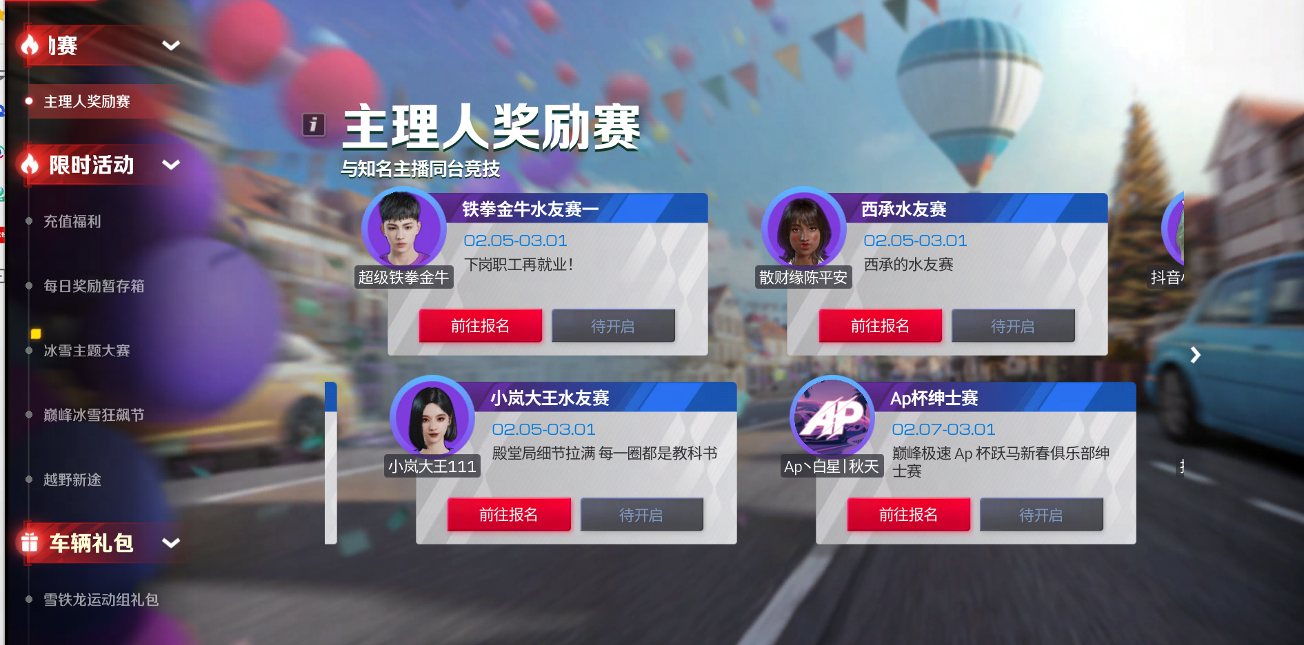 打开游戏进入「主理人奖励赛」专题页,挑一场你最爱的赛事,油门踩到底,快乐不打烊!