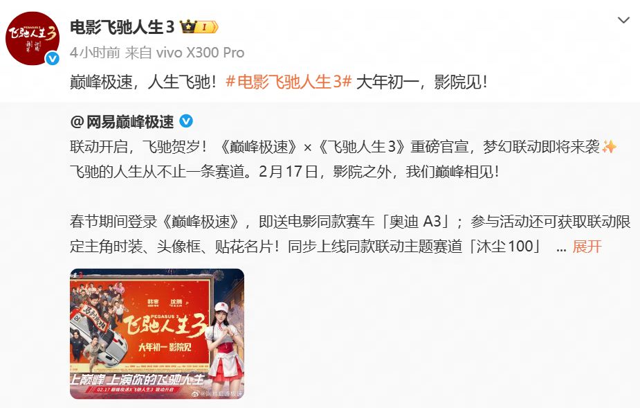 联动开启,飞驰贺岁!《巅峰极速》×《飞驰人生3》重磅官宣,梦幻联动即将来袭!飞驰的人生从不止一条赛道。2月17日,影院之外,我们巅峰相见!