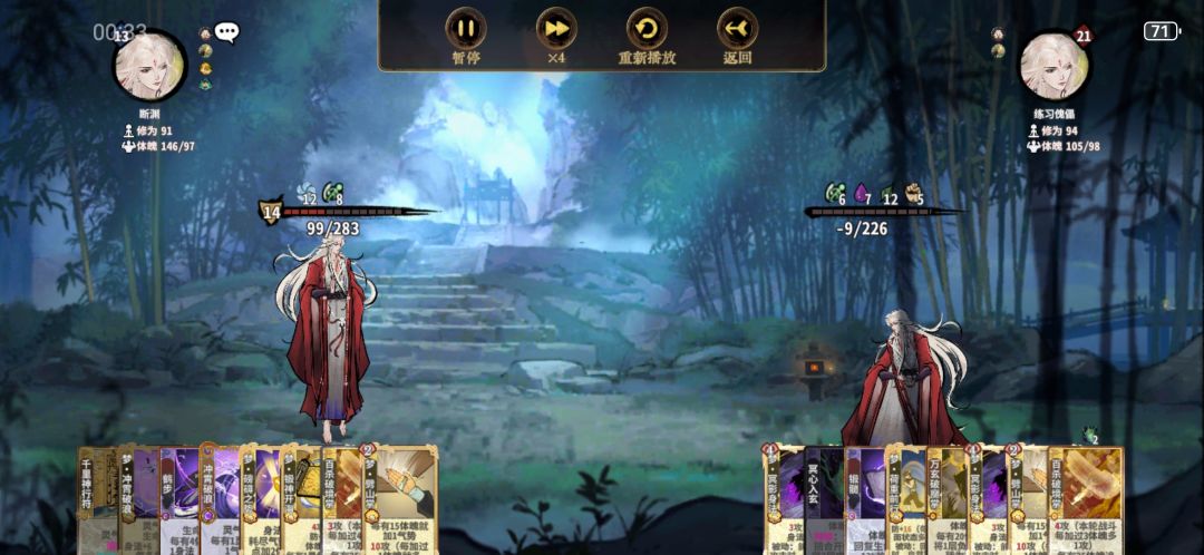 复盘,神行符升级赢了,鹤步升级赢了,狮子头升级赢了,百杀升级赢了,发张梦劈山掌赢了,发张梦金书赢了。我金书是升的,打到18轮,硬是不给牌。