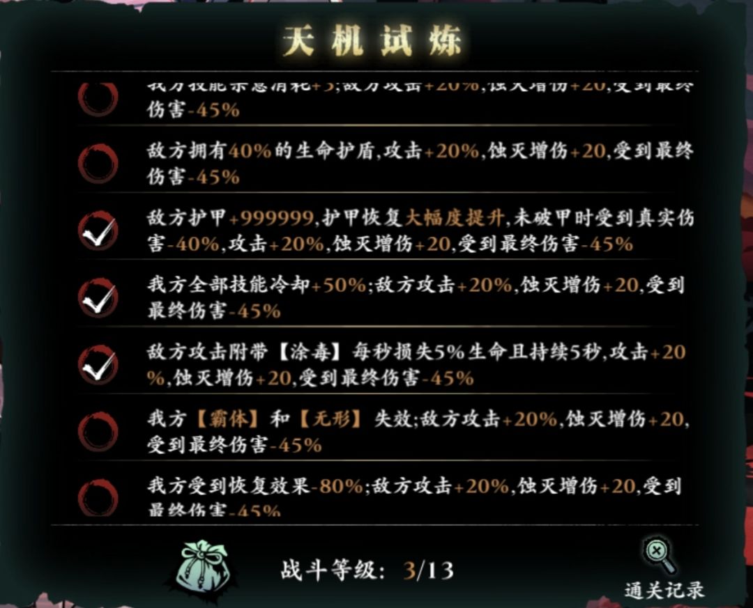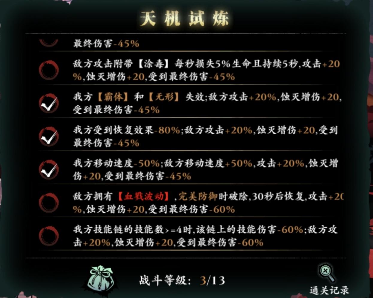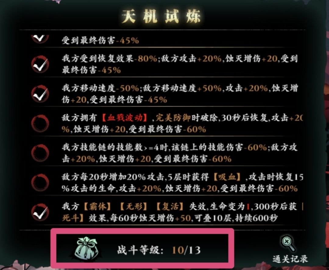 把前面你打过的9条全选上,再额外选最后一条“死斗”,注意战斗等级是10/13,就说明没错了。