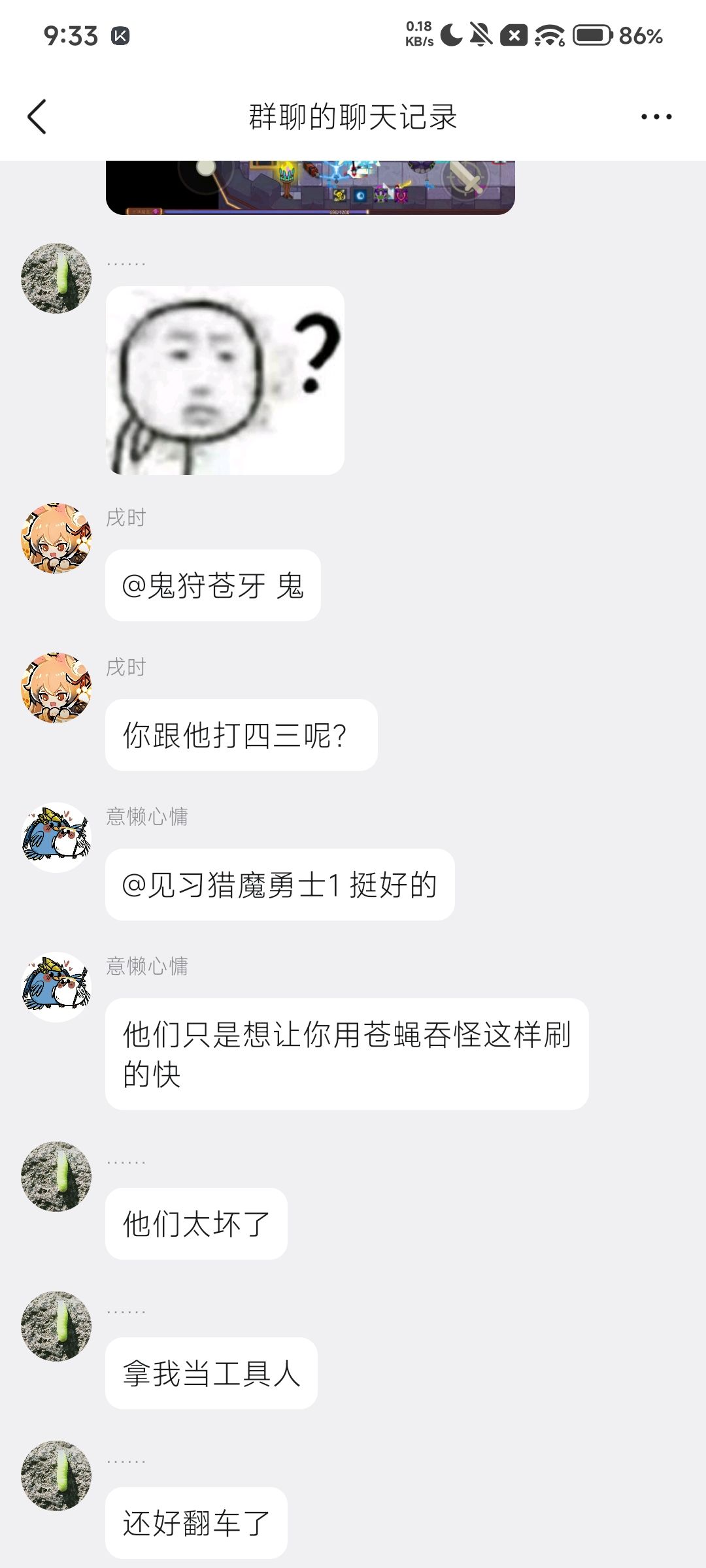 打完之后我也没管这么多,结果反手听到了在二群有我的事,我当时看了一下,总的来说就是他觉得我让他变苍蝇,是在利用他,把他当工具人了,还说什么杀一个怪已经是给我面子了
