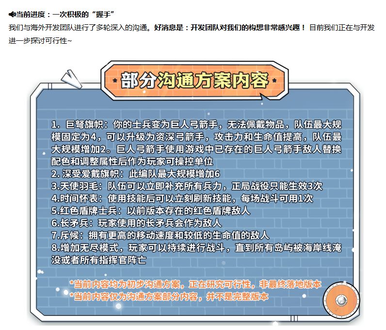 9.良心工作室和bad north(迷雾北境)开发商关于新增游戏玩法内容的建议已经得到同意。预计不久后会有吧。