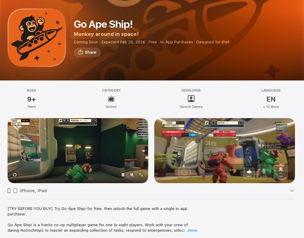 3.太空版胡闹搬家Go Ape Ship!(太空猴子号/猩空大冒险)宣布将于2月20日以付费解锁的模式登陆移动端,游戏自带中文。