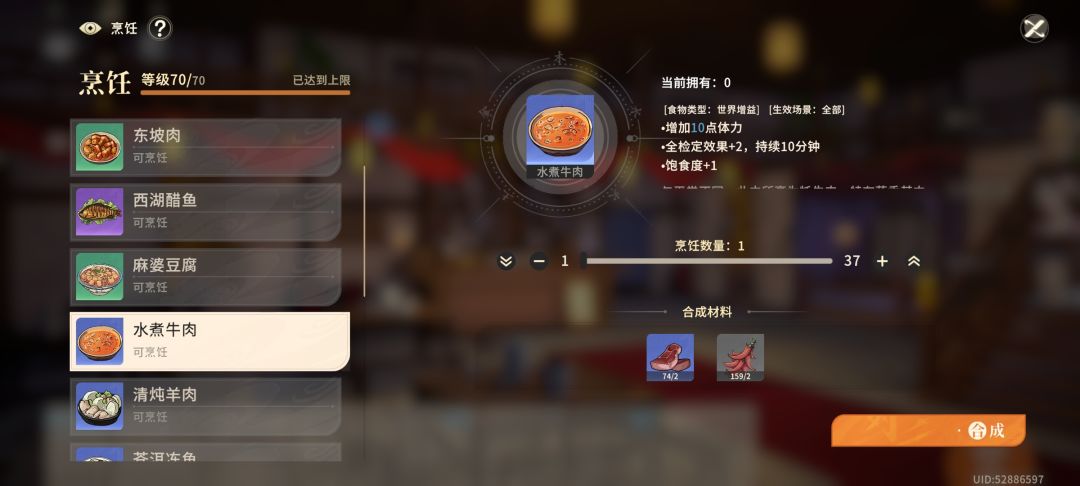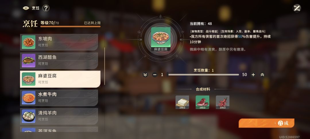 烹饪。烹饪主要是回复体力和增益buff。我们初期主要用到的就是牛肉和野猪肉。回复体力。buff主要用麻婆豆腐增加绝招伤害。后期就是龙井虾仁和熊掌。