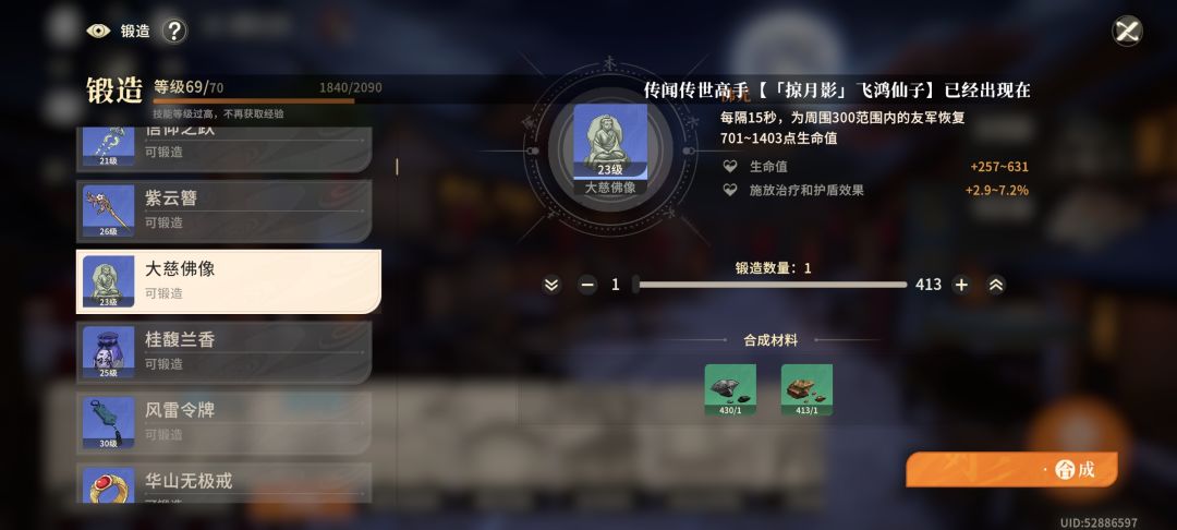 所以我们在升级的过程中尽量用其他丹药来提升60级,把海马留下升70。升到70后可以制作金色丹药也就是永久属性丹药。正常的话我们产出的丹药都是过量的,所以制作多出来的丹药可以出售换钱买矿石材料。