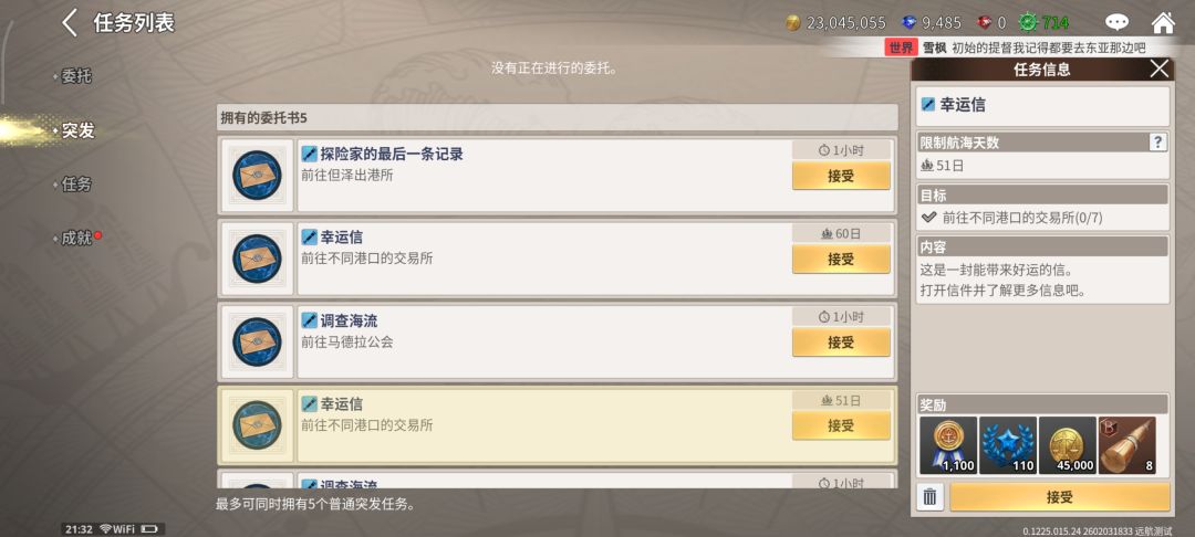 在跑商过程中捡了一堆的漂流瓶,可以在菜单任务突发这里看到触发了一些任务,接取合适任务进行。