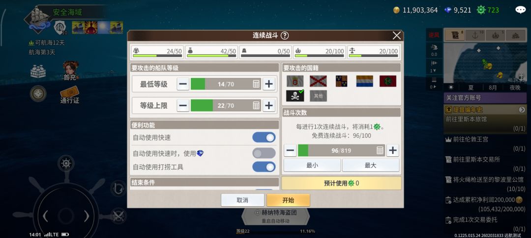 等级15后左下角船舵有个攻击标志,每天免费自动战斗100次。设置合理的等级,这样可以打些造船材料!顺便增加等级。