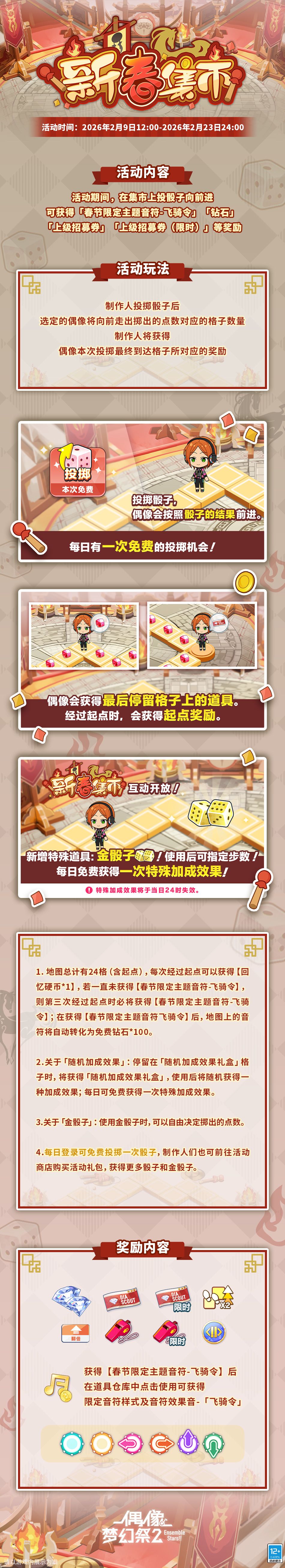 ▶地图总计有24格(含起点),每次经过起点可以获得【回忆硬币*1】,若一直未获得【春节限定主题音符-飞骑令】,则第三次经过起点时必将获得【春节限定主题音符-飞骑令】;在获得【春节限定主题音符-飞骑令】后,地图上的音符将自动转化为免费钻石*100。