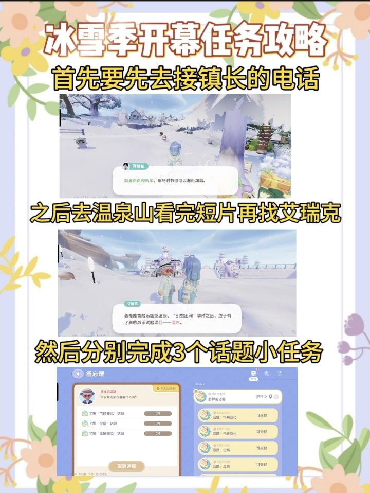上线先去接阿塔拉电话-之后去温泉山看完2分钟短片过后找艾瑞克谈话-然后完成3个话题任务-之后去找两个谈话-然后开始做冰雪季的各个任务了