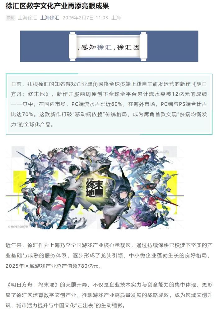 上海徐汇盛赞《明日方舟:终末地》是“多端均衡发力”的全球化产品“,并表示《明日方舟:终末地》是中国文化“创新表达、全球传播”的重要实践,让海外玩家在沉浸式体验中感受中国文化魅力。