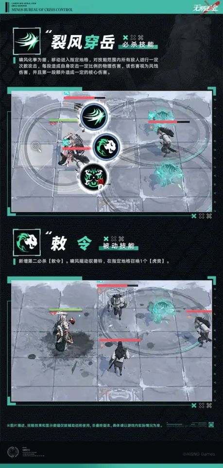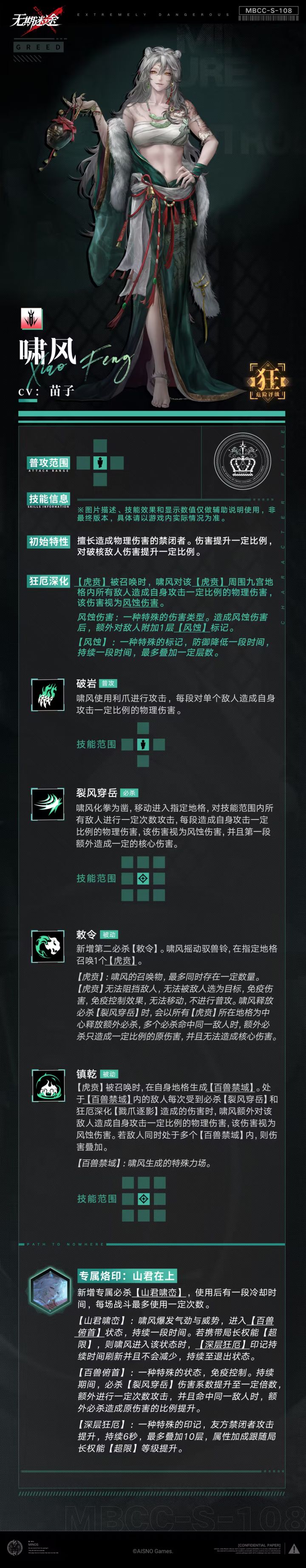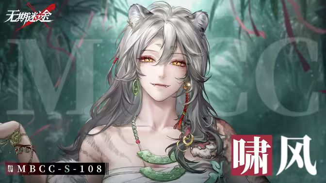 据已公布信息,【啸风】编号MBCC-S-108,组别无厌,稀有度狂,异能是号令百兽,从小被母虎养大,可以与百兽沟通,并用戴在手上的驭兽摇铃号令百兽随自己一同战斗。