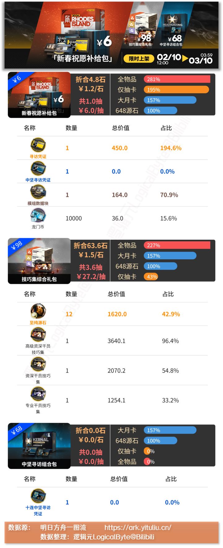 PS:中坚礼包全物品性价比小于仅抽卡是正常的,因为仅抽卡是按抽数算的,全物品是按价值算的,中坚寻访的价值按黄票商店打了个折。