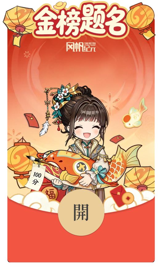 睦抱锦鲤而来,以“金榜题名”相贺,为你送来的才华与捷报祝福。愿你笔下生花,心中所想尽得高分,无论是职场KPI还是上学考试,都能一举夺魁,金榜题名!新的一年在《风帆纪元》手游,收获属于航海时代的满分福运与荣光!