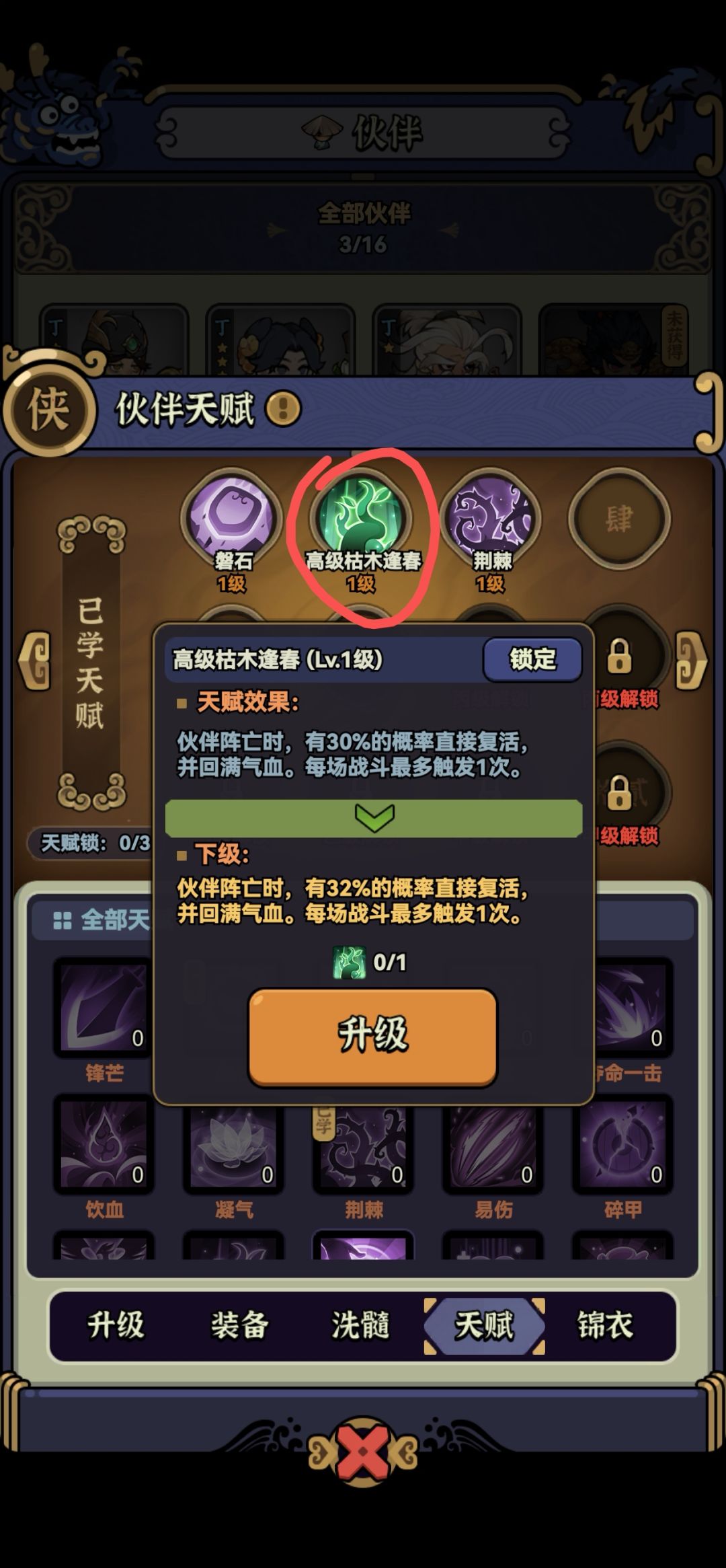 前期优先培养成型可用的伙伴,用洗髓丹刷伙伴等级解锁天赋格子(甲等五星最高上限),再用普通天赋把天赋格子上满,最后在上高等天赋,避免高等天赋被洗掉
