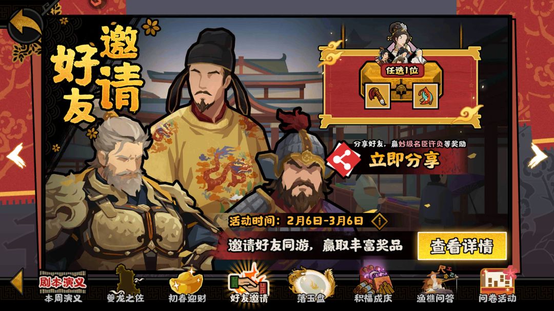 好友邀请还是老样子,许负的优先级最高,许慎的优先级最低,伯牙子期和桓伊看情况。伯牙子期需要配合好感度太守在多势力爆战力,桓伊需要配合乐感流名臣加攻占进度。现阶段不管是战斗力还是攻占进度都贬值了,基本也都用不到,不过桓伊的武将技帅一点,所以我更推荐桓伊一些。顺便给不知道的王上说下,分享活动可以把链接复制到不同的浏览器,自己就能完成。