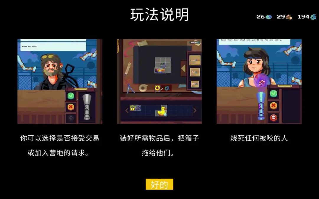 营地大了之后自然会有幸存者前来交易或是投奔。交易很简单,把物品放到盒子里打包好给他就行,给的东西越多得到的钱就越多,如果正好是幸存者需要的,单价还会更高。