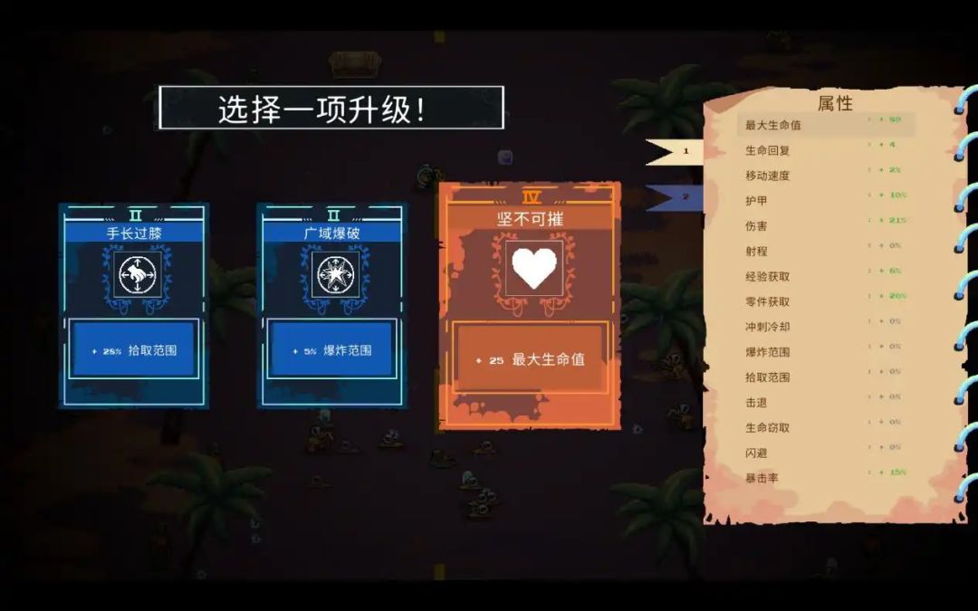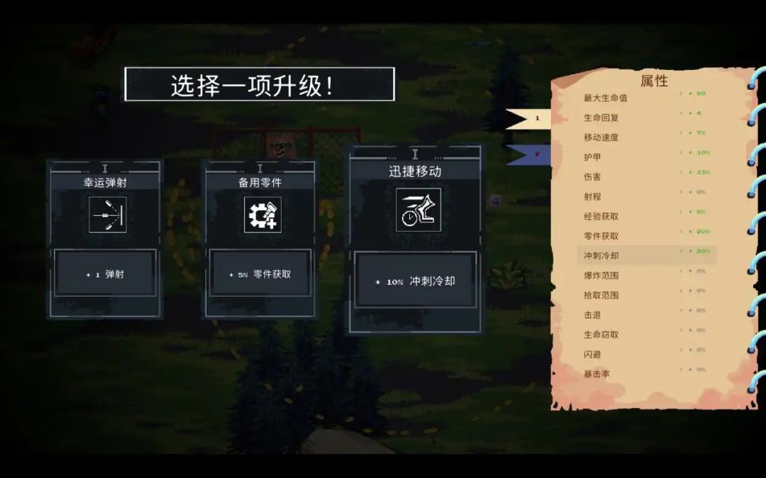 击杀这些丧尸不仅会掉落“钱”、“血包”,还会掉落经验值,不过都需要我们靠近拾取。而经验值拾取到一定数量后就能进行升级,从三项加成中选择其一(单局游戏有效)。