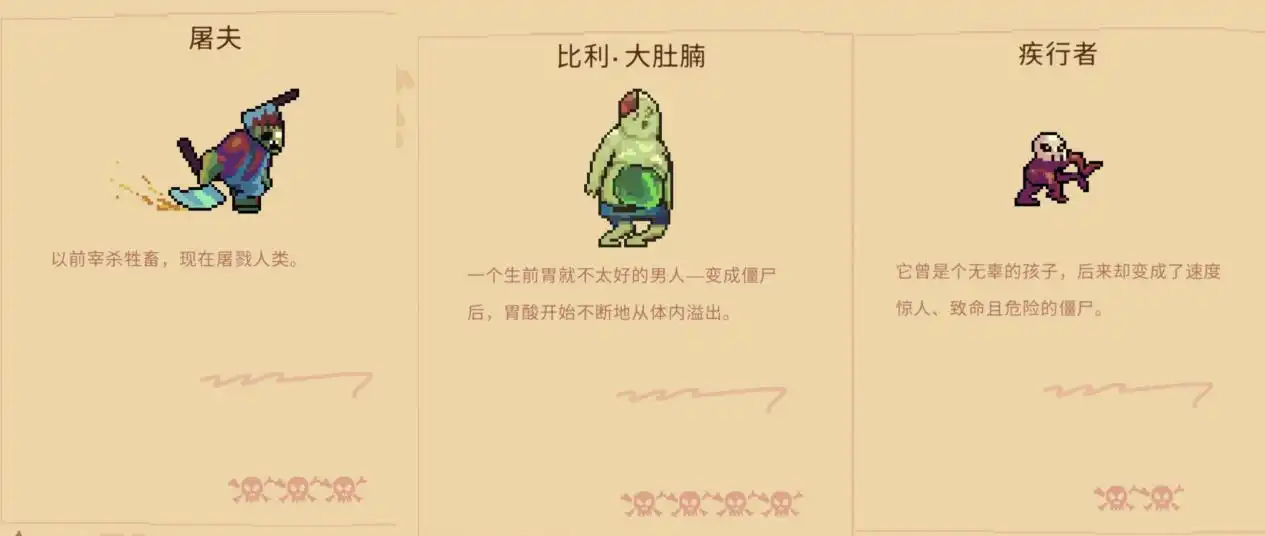 此外丧尸的种类也有很多:伤害很高的“屠夫”、喷射酸性溶液的"大胃袋"、速度很快的"急行者"、“心碎新娘”以及“暴躁老奶”(跟植物大战僵尸里那个拿报纸的老头一样,纯疯子)。