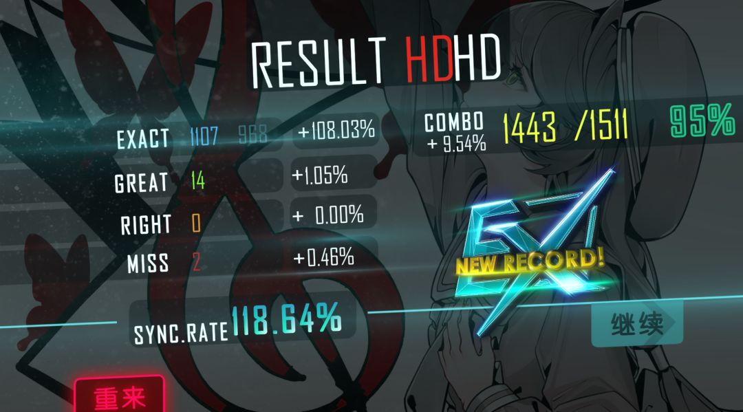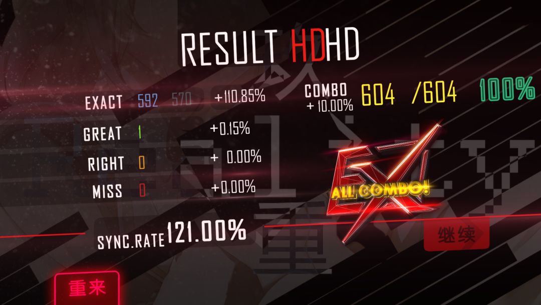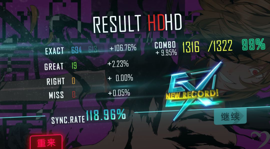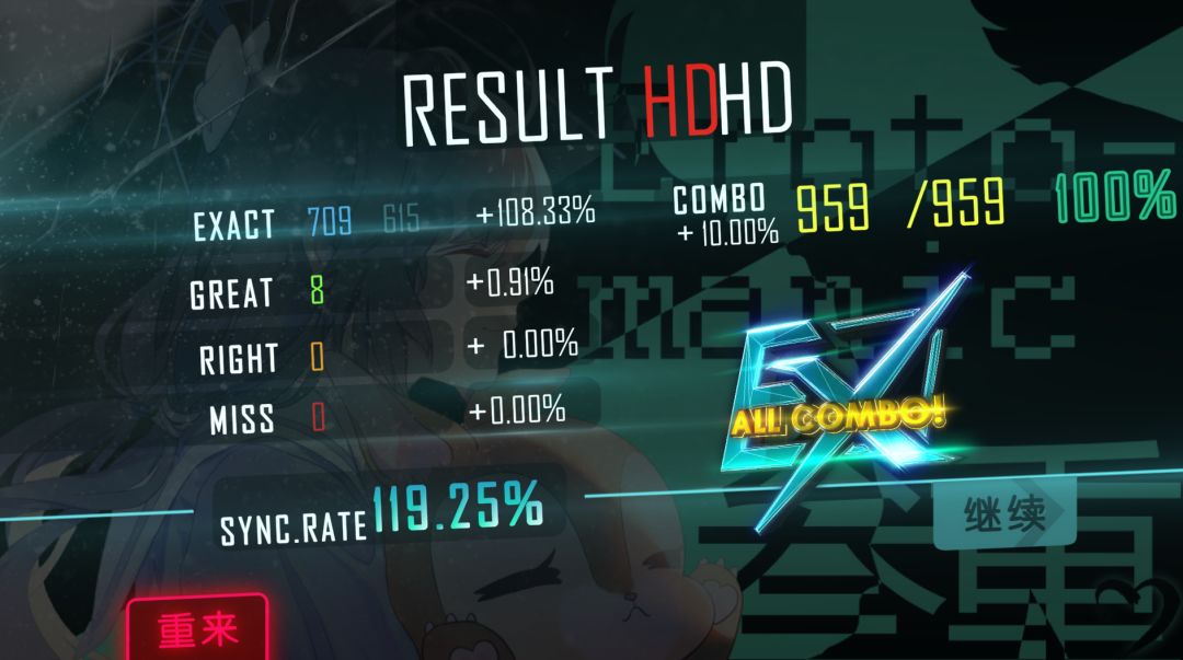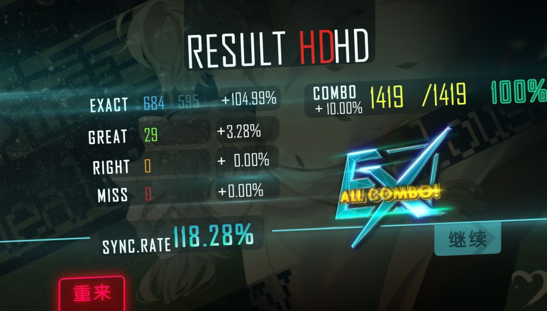 打得时候虽说有冲分的成分,还是打得很开心的,正好在我实力上限附近,曲子也非常好听,顺便给一些曲子的EX换了个颜色!