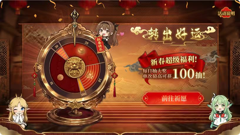 最吸引眼球的肯定是那个转出好运活动,从2月12号到3月11号,只要登录就能参加转盘,人人至少能拿到一次100抽的机会,这免费福利谁不爱啊。当然这个活动可能会把那些非洲玩家气退坑