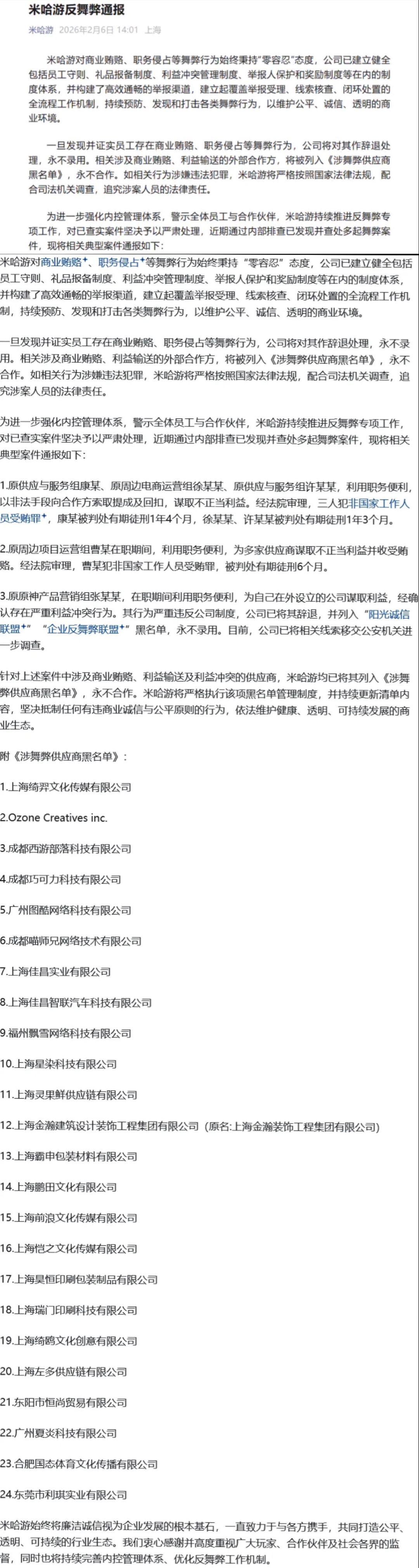 近日,上海米哈游网络科技股份有限公司发布内部反舞弊通报,查实多起员工腐败案件,消息迅速引发全网热议,成为游戏圈焦点“大瓜”。作为旗下现象级开放世界冒险游戏《原神》的研发发行方,米哈游此次内部严查力度空前,以“零容忍”态度严肃处理涉事人员,彰显企业合规治理决心。