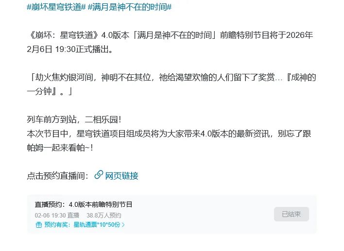 节目播出后,各平台热搜、话题阅读量、直播回放数据持续攀升,米游社、TapTap、微博、抖音等社区讨论量暴涨,玩家纷纷晒福利清单、规划抽卡与养成、解读剧情伏笔,期待值拉满。不少玩家直言“4.0直接把期待感拉到顶点”“长草期彻底结束,春节被星穹承包”,热度与好评双向爆发。