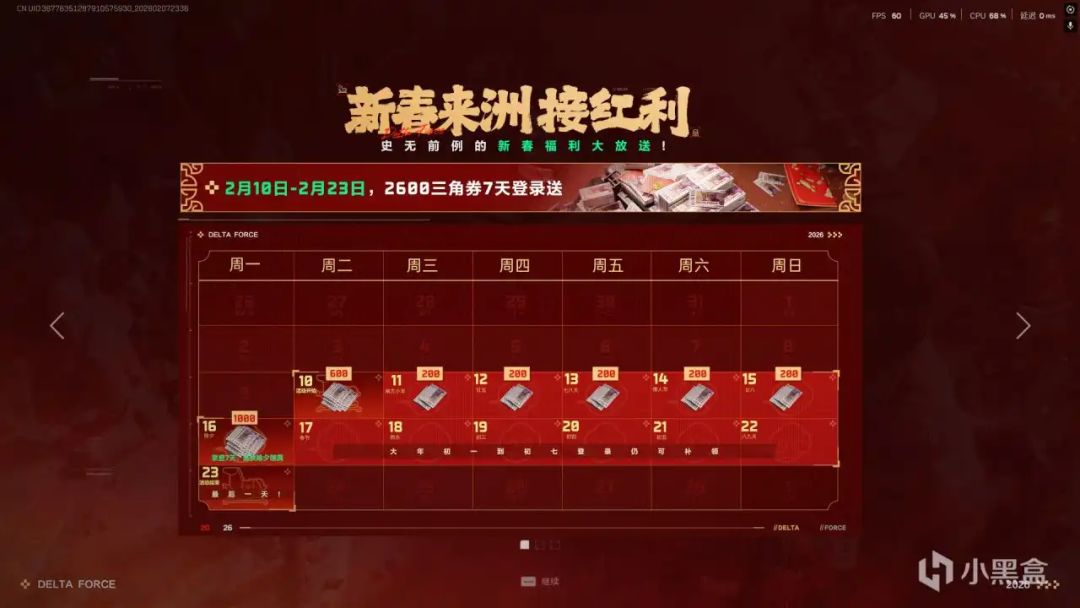 2月10日到2月23日期间登录三角洲每日赠送限时点券!共计2600点券10号还会上线威龙的干员研究皮肤「凌霄戍卫」可以用限时点券来抽,也可以抽之前的红狼、麦晓雯的皮肤