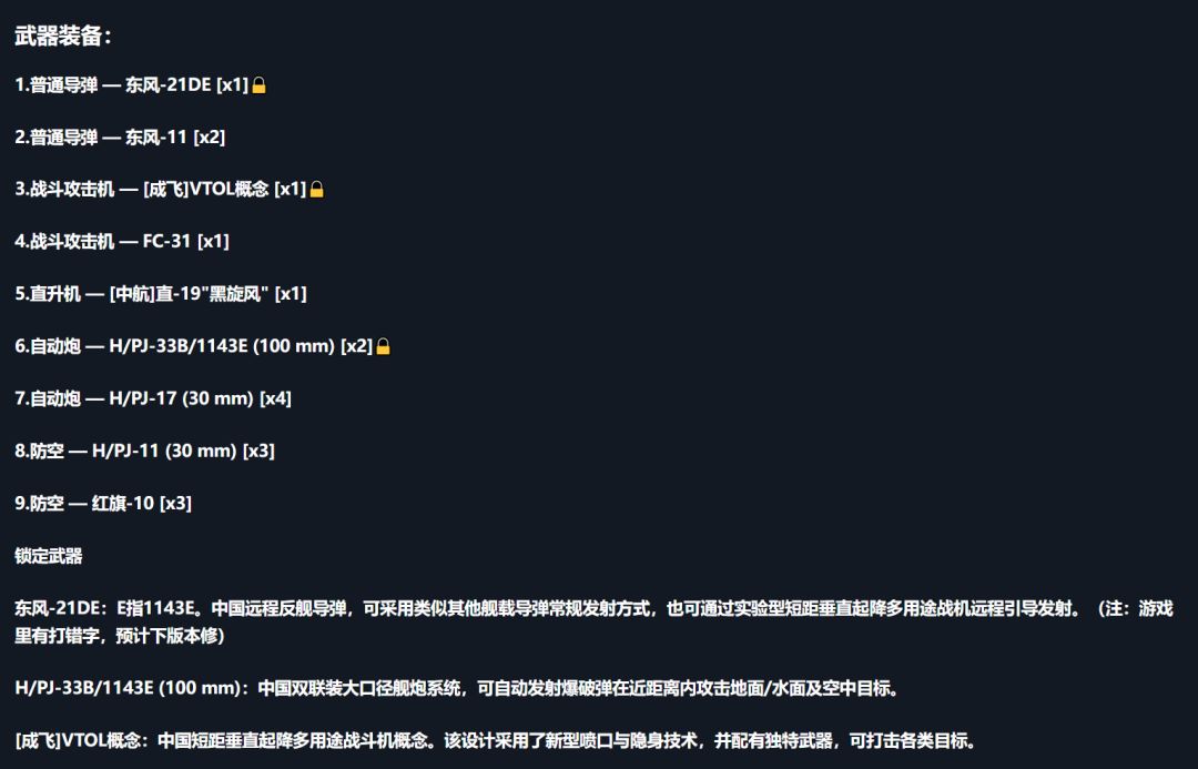 东风-21DE:E指1143E。中国远程反舰导弹,可采用类似其他舰载导弹常规发射方式,也可通过实验型短距垂直起降多用途战机远程引导发射。(注:游戏里有打错字,预计下版本修)