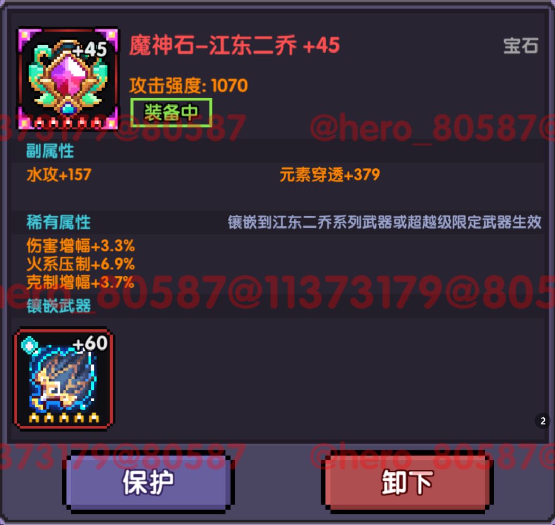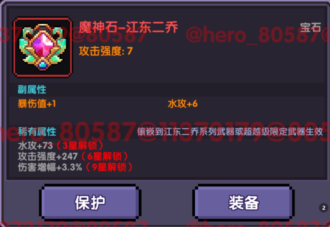 稀有属性:伤害增幅,水攻,攻击强度(80级技能后)、伤害增幅,技能等级,水攻/攻击强度(80级技能前)