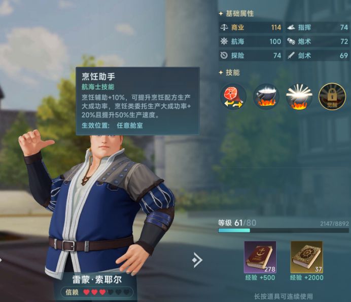 这个时期需要积攒体力药、海灵祝福和雷灵祝福,因为商业仅仅靠肝就可以了。风灵祝福正常开,其他经验加成的道具可以留给后期冲海事!期间正常恢复的体力可以用来做一做船只改仓的基础材料,比如蓝木、蓝铁等等,还可以生产卖鱼面、酸海鲜这些料理。