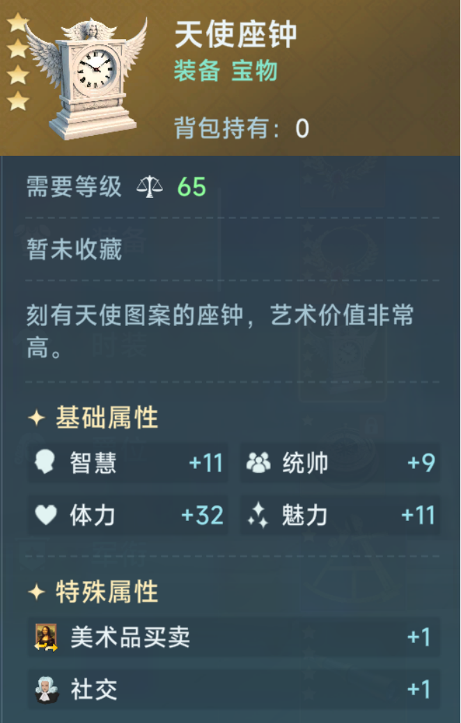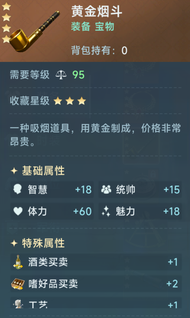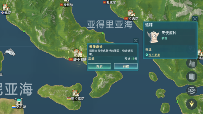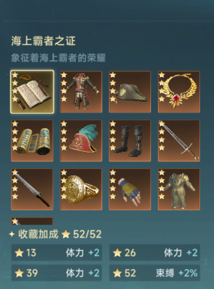 直奔主题,商业反哺海事的手段就是高等级且高星级宝物补体力,高等级的商船平替战船来节省造船金币!首先来说高等级宝物,在商业等级60级时即可在那不勒斯裁缝购买“天使座钟”,建议合两个三星的天使座钟装备上。然后将商业等级肝到95级,即可将“座钟”换成“黄金烟斗”。在升级期间可以开始收集这件装备了,如果只有一个三星烟斗,可以将座钟合成四星,装备一个三星烟斗、一个四星座钟。等到集齐八个烟斗,可以合成两个三星烟斗,淘汰掉四星座钟。不是纯商玩家不建议合成四星烟斗,毕竟烟斗后期可以拆掉回一波材料。来升级“九柱神之书”或者“军神的护身符”。