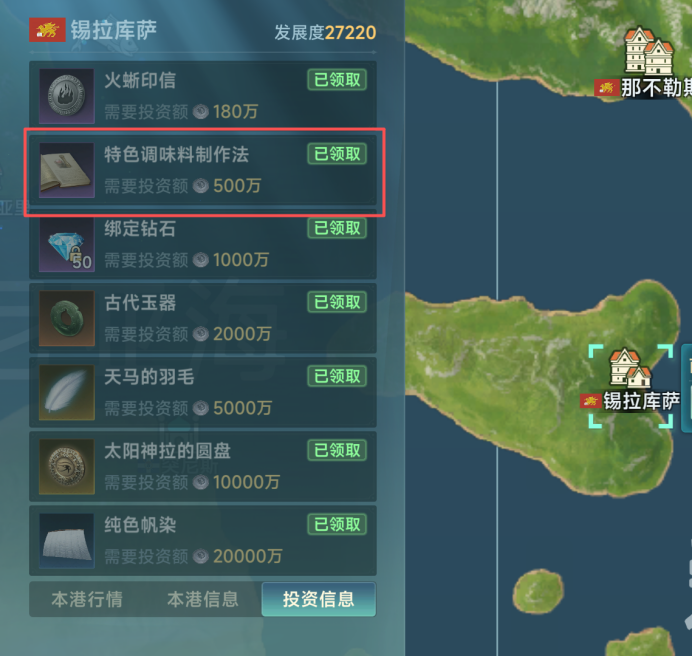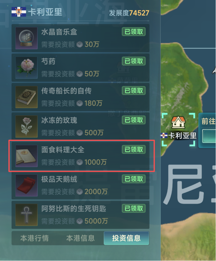 然后我们要学会生产“酸橘汁腌海鲜”,这里需要加勒比的烹饪书,可以在军人玩家手里买,也可以跟着去刷。综合等级达到120级后,可以在哈瓦那门口钓鱼。需要军曹鱼和大虾,哈瓦那门口都可以钓到。前期我们通过生产“鱼面”应该可以轻松达到14级的烹饪等级了,可以上线收鱼时候顺手就做了。“酸橘汁腌海鲜”是+17的料理,更加深受氪金玩家喜爱。此期间可以招募雅典航海士方便我们跑商,可以招募亚历山大航海士方便我们通过中南美开拓任务。