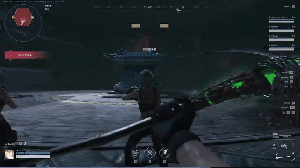 第一种,“蛇神”单手持巨剑,巨剑被红色能量包裹后,蛇神将会持剑砸向地面,该技能比较容易躲掉,“闪身”位移以及切换近战提前撤退都可以破局。