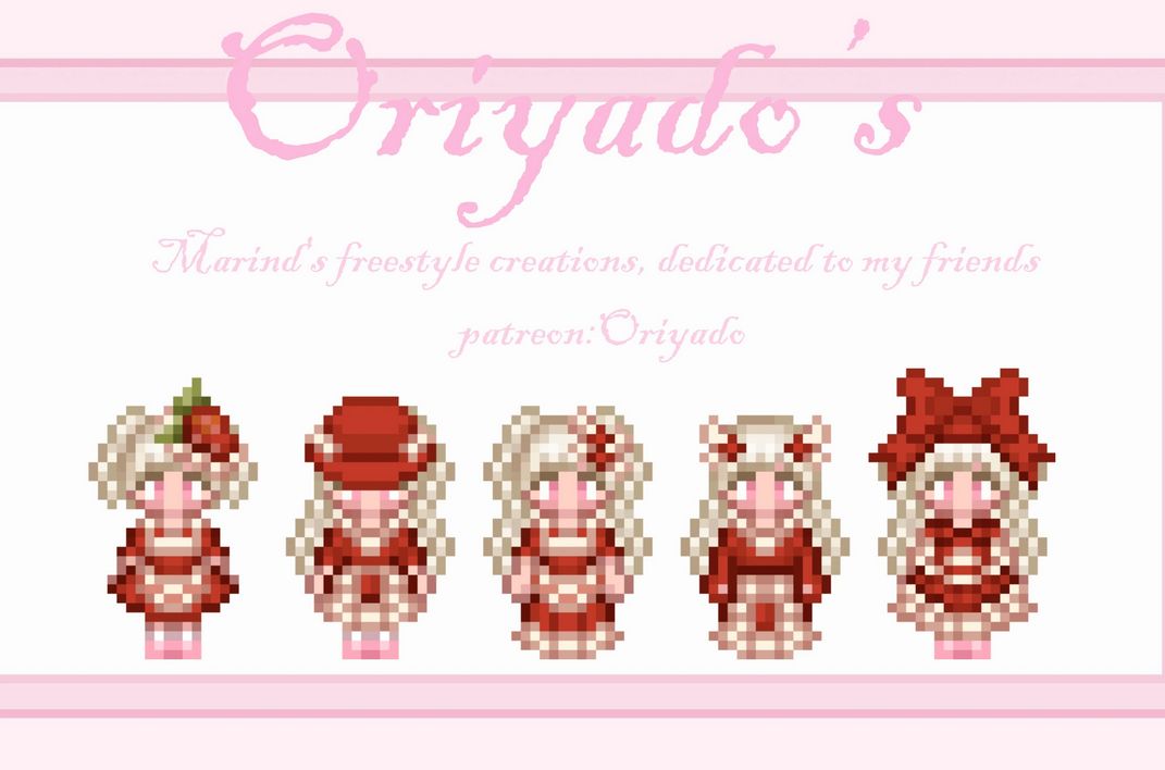 草莓果酱系列服饰,包括五顶帽子、五件衬衫、五条裤子