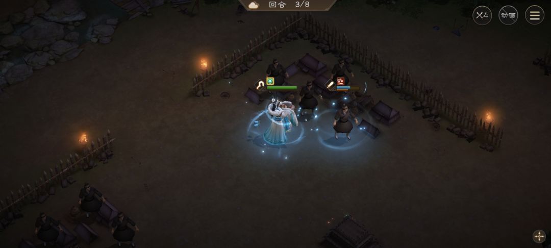 4.第三回合,蔡炎单体给左上负面平民,华佗往右上跑的位置卡地图位一技能群体给右上最后三个回满血。