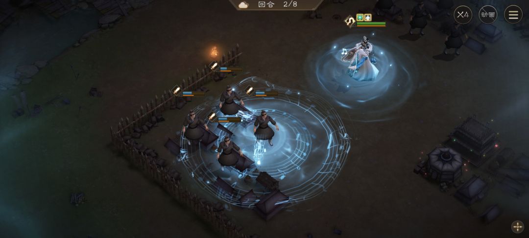 5.第四回合,华佗往左上位置,二技能给单体最低加血,蔡炎任意待命,直接被动加满所有血。
