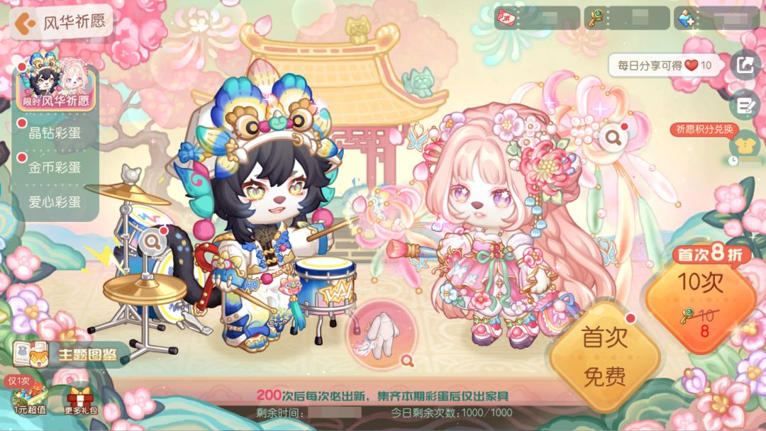 活动介绍:主题彩蛋「风华祈愿」限时登场!彩蛋上新送福利!新彩蛋上线后可免费抽取一次,首次使用时空之钥和晶钻抽取10连还可分别享受首次8折优惠!彩蛋奖励包含晨星品质时装「瓦猫鼓手套装」「绒花造梦套装」以及晨星品质家具套装「绒花绣坊」系列等全新礼物!还有典藏品质的「皮影手绘师套装」「景泰蓝茶艺套装」和家具「围炉茶楼」系列,装扮单品「燃情瓦猫腰巾」「吉星高照瓦猫」「绒花轻纱卷帘」「曼妙绒花拖尾」等限时奖励哦!