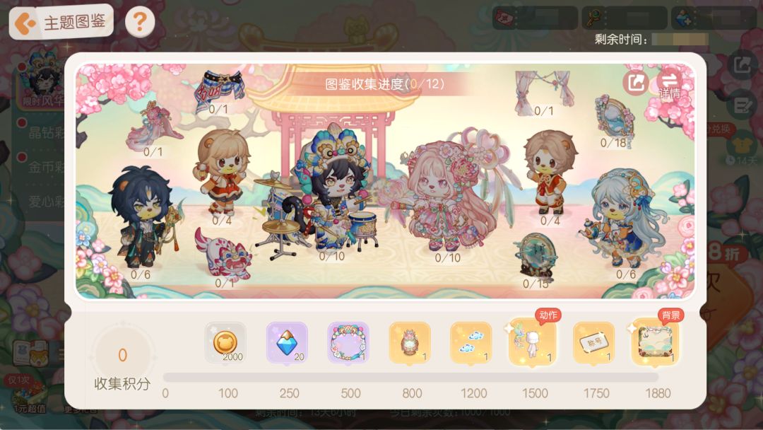 活动介绍:主题图鉴活动开启!活动时间内完成收集主题图鉴内收录的装扮部件,即可获得对应收集积分,前来收集解锁对应的进度奖励吧。奖励包括丰厚的晶钻和装扮物品,达成对应进度可解锁头像框「潮韵双生」、家具散件「绒意福猫彩蛋」、足迹「绒花足迹」、动作部件「翎羽点睛」、称号「一缕风华照古今」等奖励,达成最终积分进度还可领取背景卡「非遗风华背景」等限时奖励!